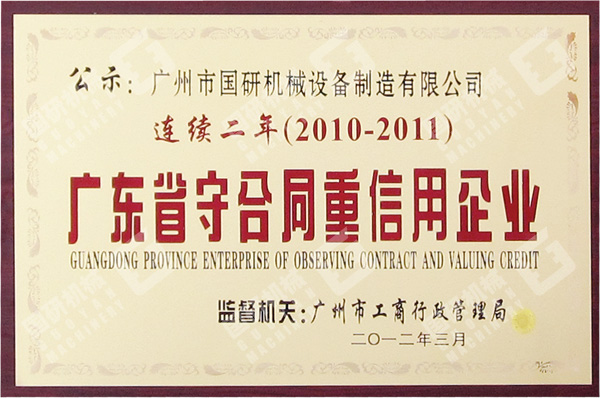 2012年3月,广州市国研机械设备制造有限公司被评为2011年度“广东省守合同重信用企业”。这是我司继连续三年被评为“广州市守合同重信用企业”之后,连续两年获此殊荣。